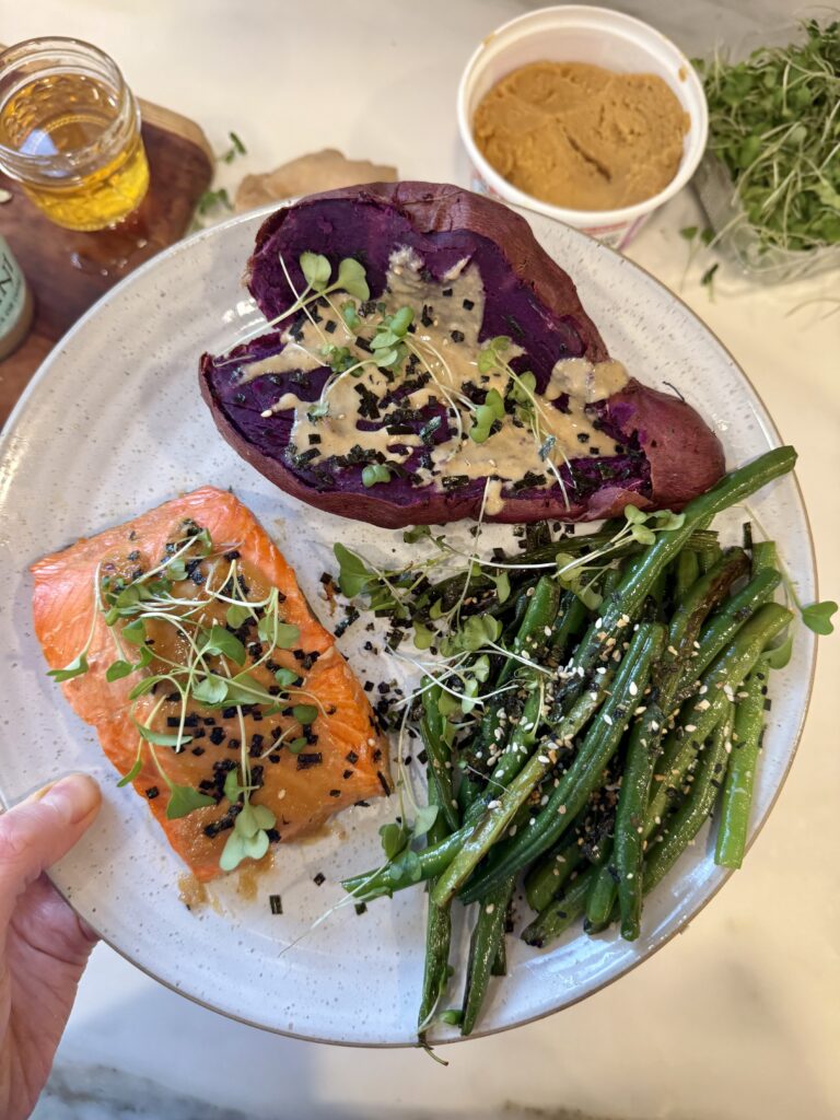 Miso Salmon with Baked Purple Sweet Potatoes