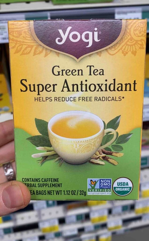 If you’re not a matcha fan, try this Super Antioxidant Green Tea by Yogi (below). It has a mild pleasant taste, is easy, and is readily available at most grocery stores.