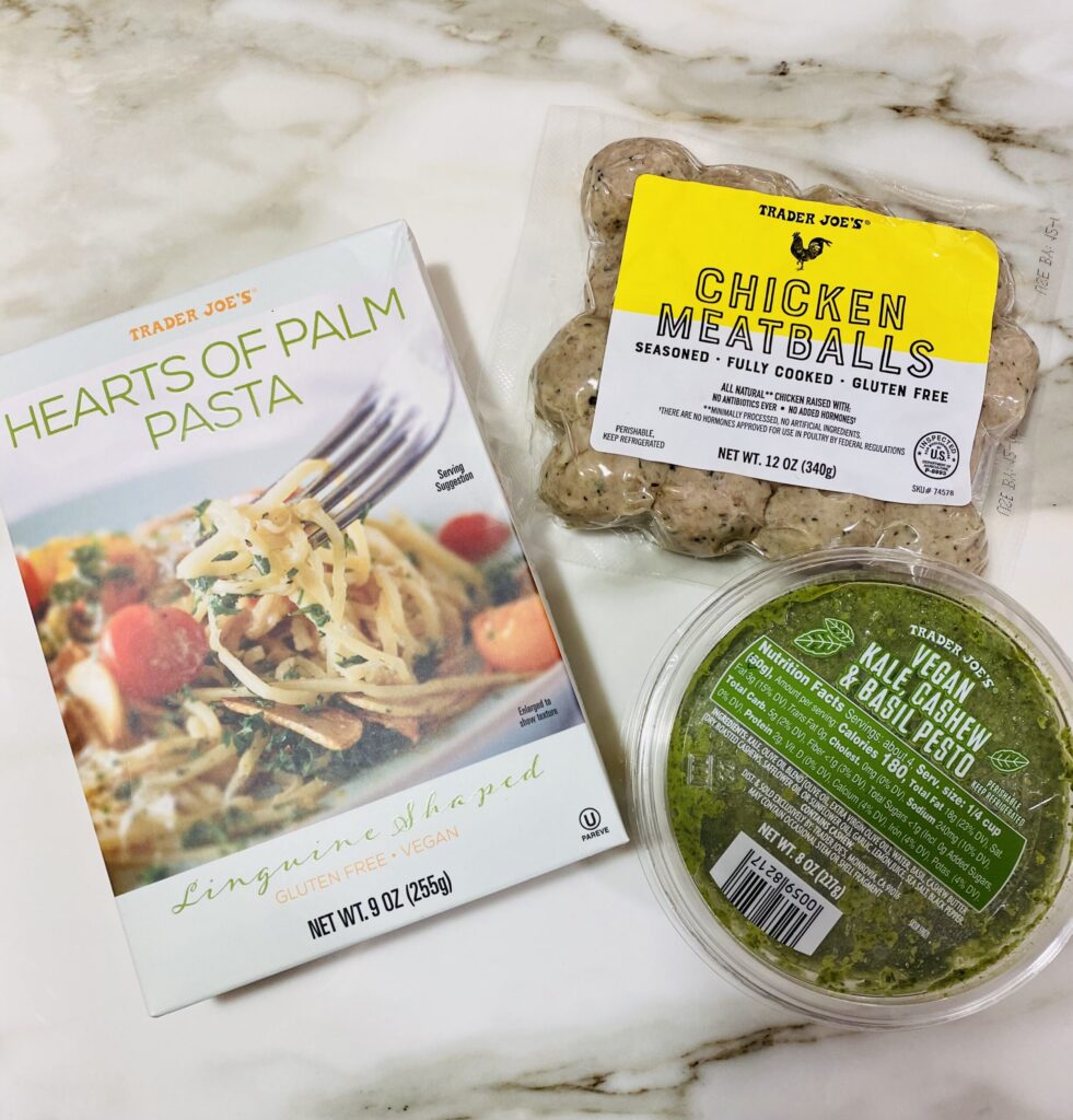 This 3-Ingredient Hearts of Palm “pasta” recipe is a staple of mine when I am in a hurry. Unlike most dried pastas, it does not need to be boiled (making it ready in a flash!), is low in carbs, and is packed full of fiber. It’s technically not a pasta as it is made from vegetables, but you can treat it just as you would pasta- add in a dollop of Kale Cashew Pesto and pre-made chicken meatballs. Voila- dinner is ready in less than 5 minutes!